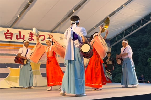 白峰の伝統芸能。717年に白山を開山したと言われる僧・泰澄が山へ行き、村人が帰りを待ち望み迎えに行ったところ、泰澄が神々しい姿で現れ、喜び舞い踊ったことが起源と言われています。盆や祭りで踊られてきたかんこ踊りは、地域の人々に大切に受け継がれています。石川県指定無形文化財。