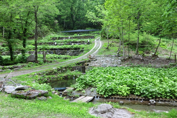 杉田わさび園(わさび栽培体験、湧水流しそうめん)にて昼食