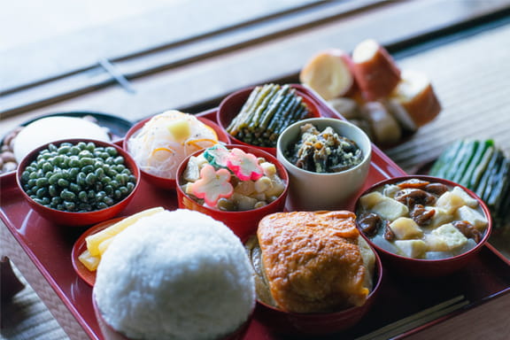 浄土真宗の「報恩講」という法要で供される報恩講料理(お斎)。白峰地域では、春の雪解けから山菜を保存し、夏野菜、秋のきのこなど、報恩講料理を中心に年間の作物収穫が行われます。白山の恵みや集落の人々への1年間の感謝の心を込めて作られる「山のごちそう」です。