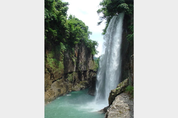 落差32メートルのダイナミックな滝。流れ落ちる水しぶきは、まるで綿が舞っているように見えるところから「綿ヶ滝」と名付けられました。白山の雪が海を目指し流れていく躍動感を感じることができます。峡谷を流れるエメラルド色の手取川も美しく見事。迫力のある滝をすぐそばで感じてください。