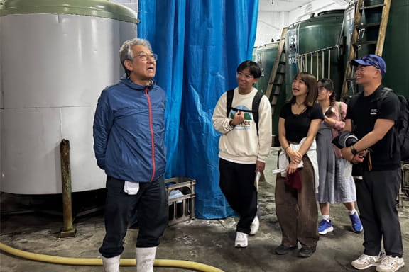 ・約100年前から使用している木桶でつくる片上醤油の醤油蔵で、実際に櫂を使って木桶の中の醤油をかき混ぜる体験・試飲