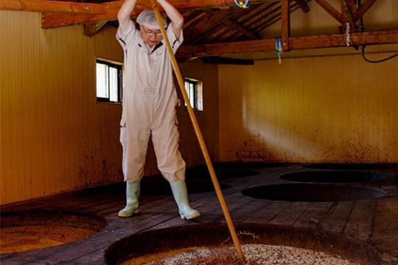 山麓の静かな里にある小さな醤油蔵「片上醤油」を見学。大切に使われてきた杉の大桶に奈良県産大豆を仕込み、じっくりと醸造する様子を見学できます。味見や櫂入れ、瓶詰めなども体験することができ、伝統の醤油造りを学べます。