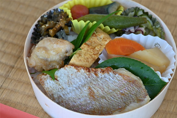 豊島に住む料理上手なお母さんたちがつくるお弁当がテイクアウト限定で購入可能。地元でとれた魚と野菜を使い、から揚げには地元産の塩を使うなど、豊島の食の魅力がお弁当に詰まっています。豊島の棚田を見下ろすベンチで食べるのがおすすめです。