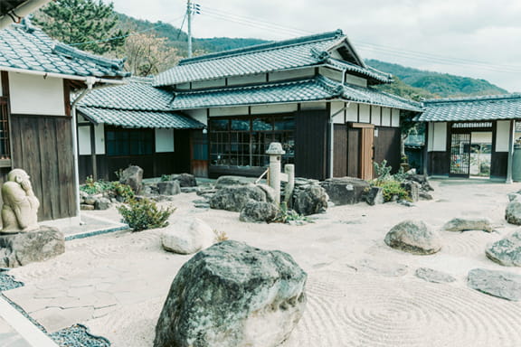築80年の古民家を改装した1棟貸しの宿。本館の定員は8名、別館の定員は6名。島の高台にあり、日本庭園越しに瀬戸内海の景色を楽しむことができます。本館、別館ともにキッチンを備えており、最大30日まで連泊できます。宿の裏手には畑と里山が広がり、農作業体験や、動物とのふれあいを楽しむことも可能です。
