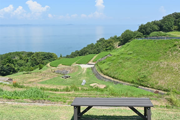 「豊島に来たら豊島のものを食べて帰ってほしい」という島のおばちゃんの思いから生まれた「てしまのお弁当」。自家栽培の野菜、鯛の味噌漬け、天日塩の塩唐揚げなど島の恵みが詰まっています。豊島の旅は、壇山・岡崎公園展望台でこのお弁当を味わい、島民ガイドによる「水がつなぐ島の物語」を聞くところから始まります。