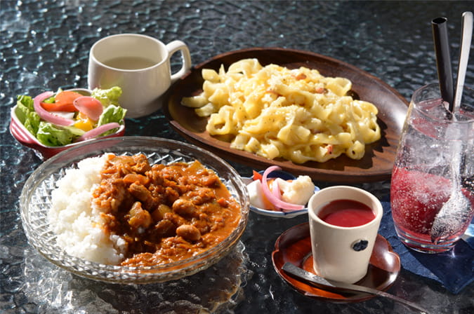 1棟貸しの宿「迎賓館えびす屋」の庭先にある、スタッフの休憩所だった建物をリノベーションしたカフェ。メニューは山梨名物・ほうとうを使ったパスタや、地元野菜をふんだんに使ったスパイシーなカレーなど。南アルプス市産スモモの実をまるごと入れたすももサイダーも人気です。
