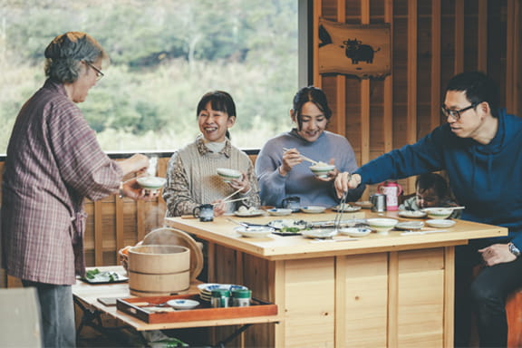 大紀町は希少価値の高い特産松阪牛の肥育地域。この地域の農家民宿では松阪牛のすき焼き体験を楽しめます。すき焼きに使う野菜やキノコも自分たちで収穫し、自分で割った薪を使って昔ながらの釜戸でごはんを炊きます。単に食べるだけでない「食×農業×体験」をぜひ。