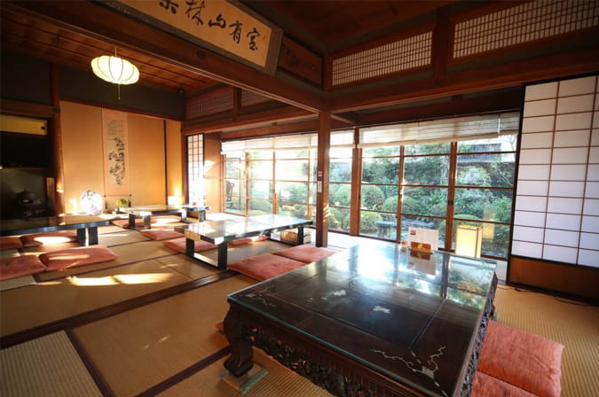 旧熊野街道沿いに位置する料理旅館。昭和レトロな雰囲気のなか、地域の旬の食材を使った本格的な懐石料理を食べられます。食事のみの利用も可能で、昼は松花堂弁当1650円~、夜は懐石料理3300円~を個室で味わえます。熊野古道を歩く外国人観光客にも人気です。