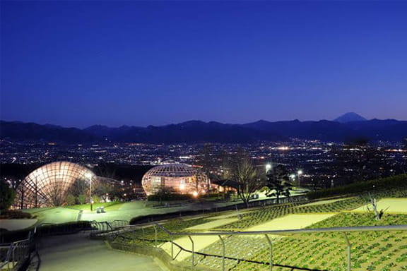 「水果公園」的視野絕佳,白天可以由正面眺望富士山、御坂連山,還能將遠處的南阿爾卑斯等群山盡收眼底。到了夜晚請盡情欣賞美麗的星空,以及獲選為「新日本三大夜景」的甲府盆地夜景。
