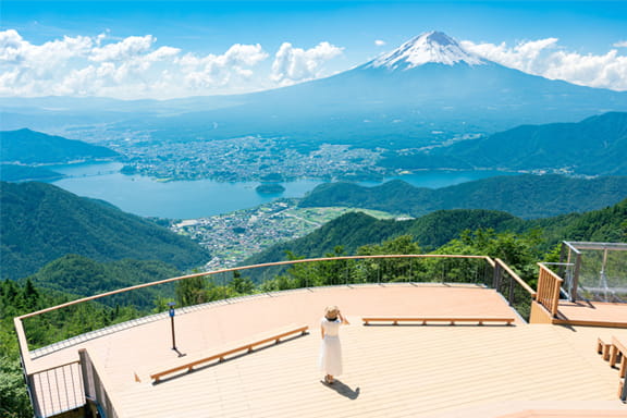 「FUJIYAMA TWIN TERRACE」是新道峠新落成的人氣絕景觀景台,可以在此一覽富士山雄姿。在背景是富士山與河口湖的絕佳位置拍攝紀念照,為山梨這一側的富士山留下美好紀錄。